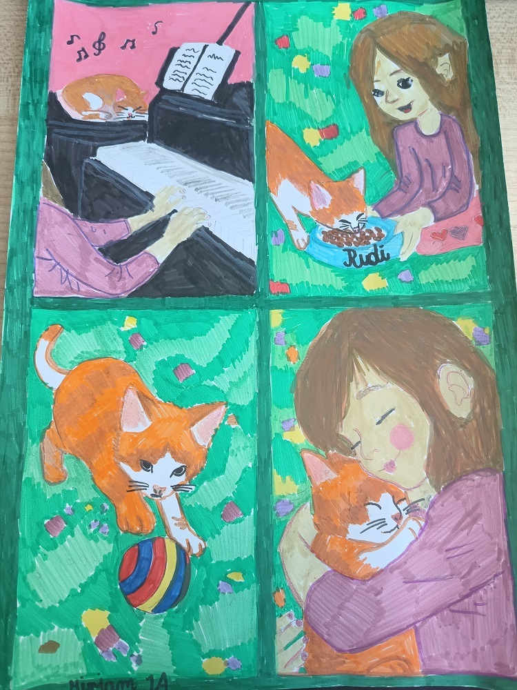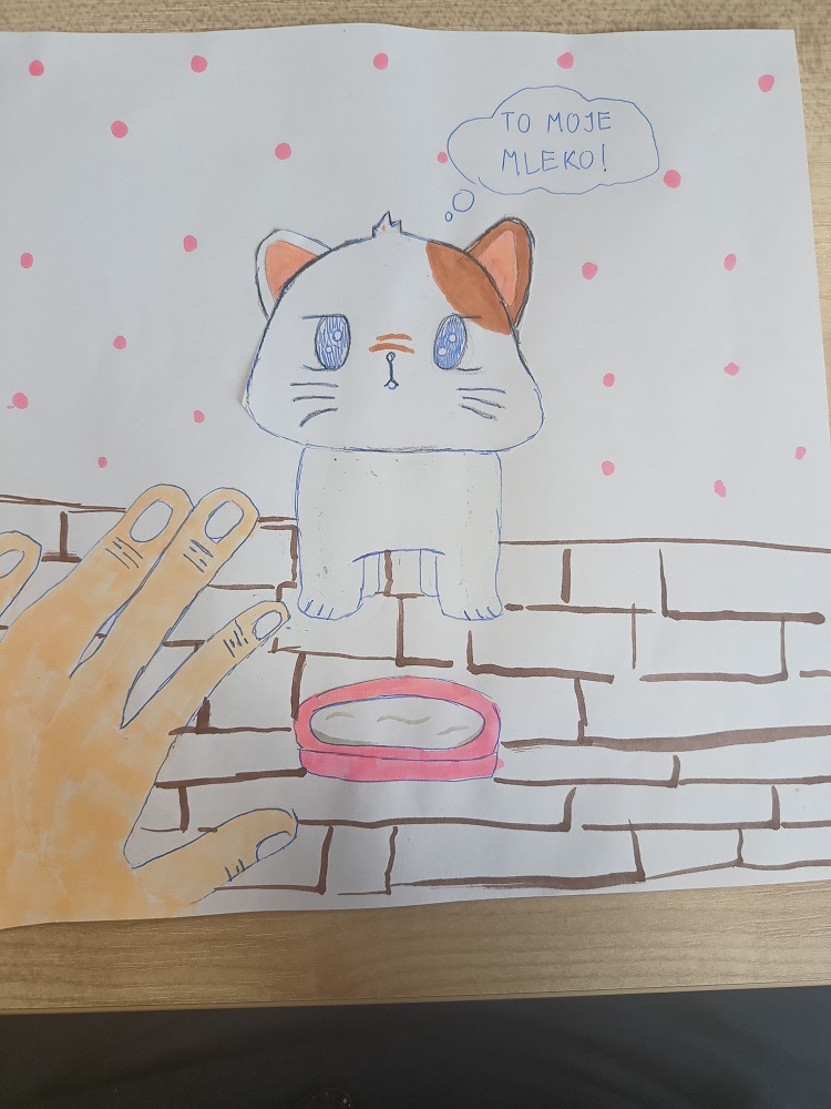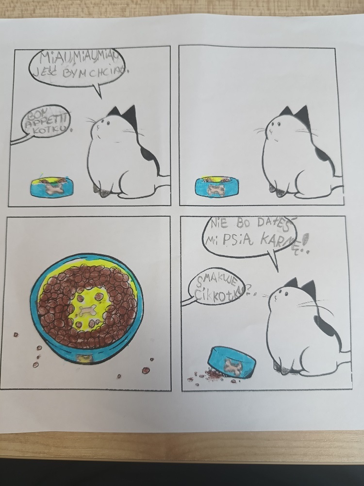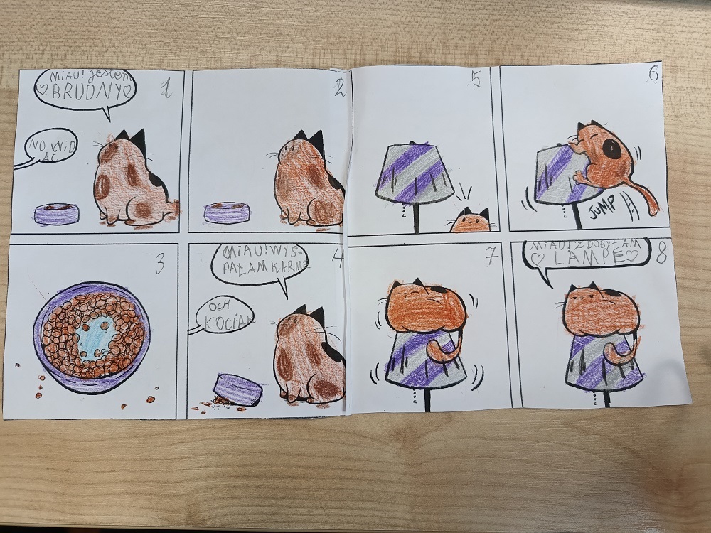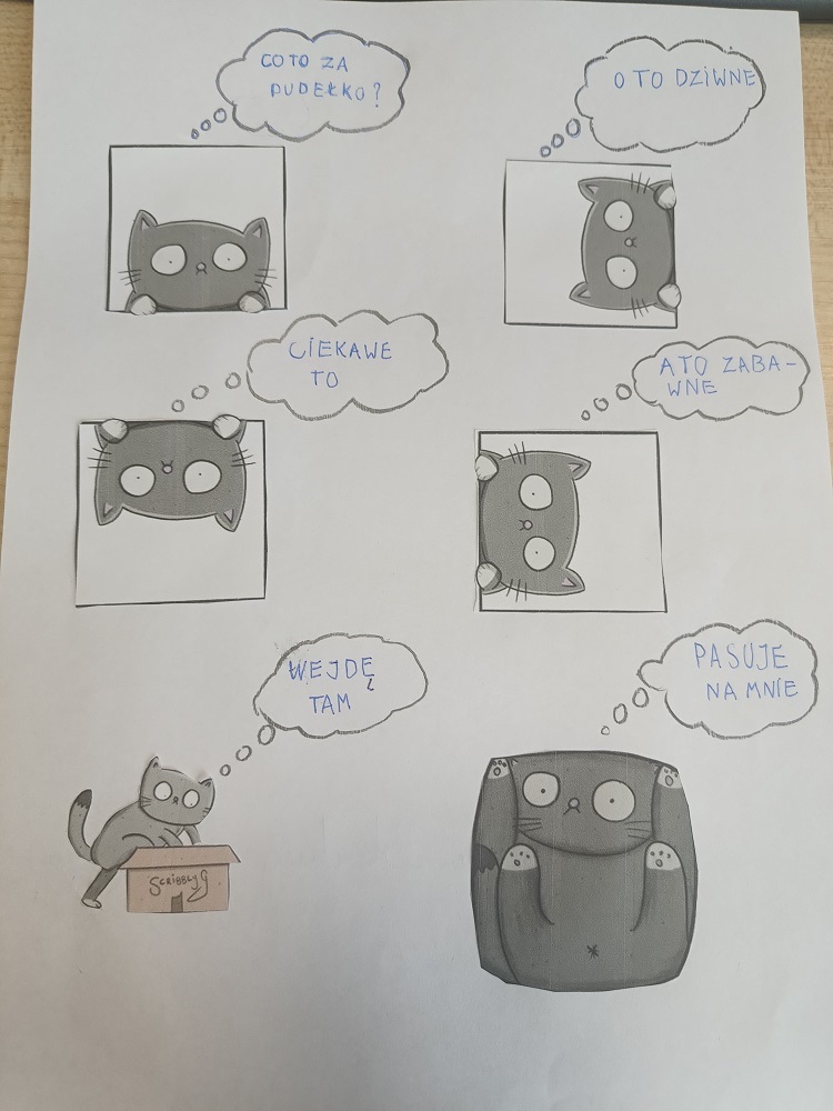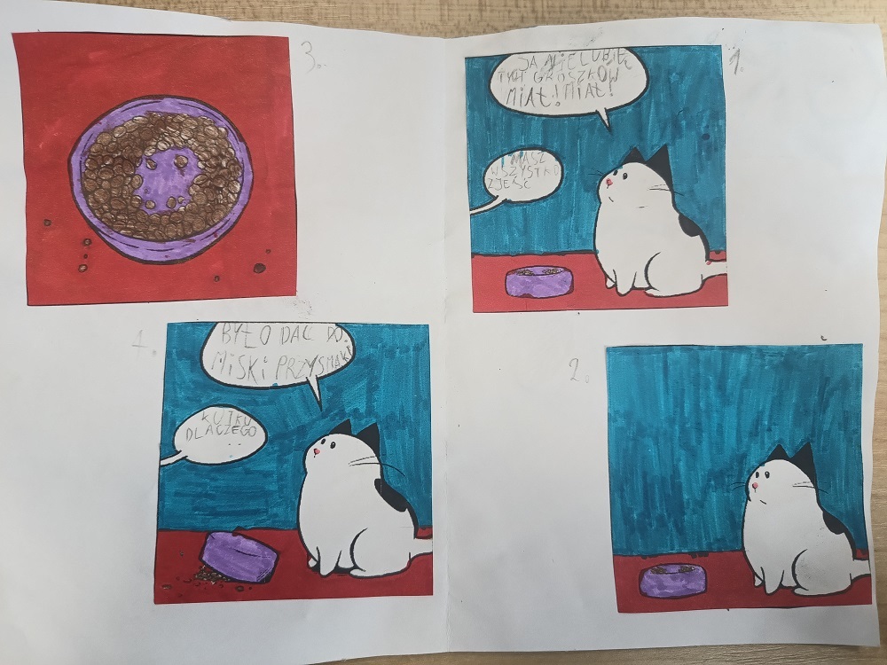 2. kreatywnego wymyślenia myśli kota "dymków" do jednego z 3 komiksów (dostępne w bibliotece szkolnej)