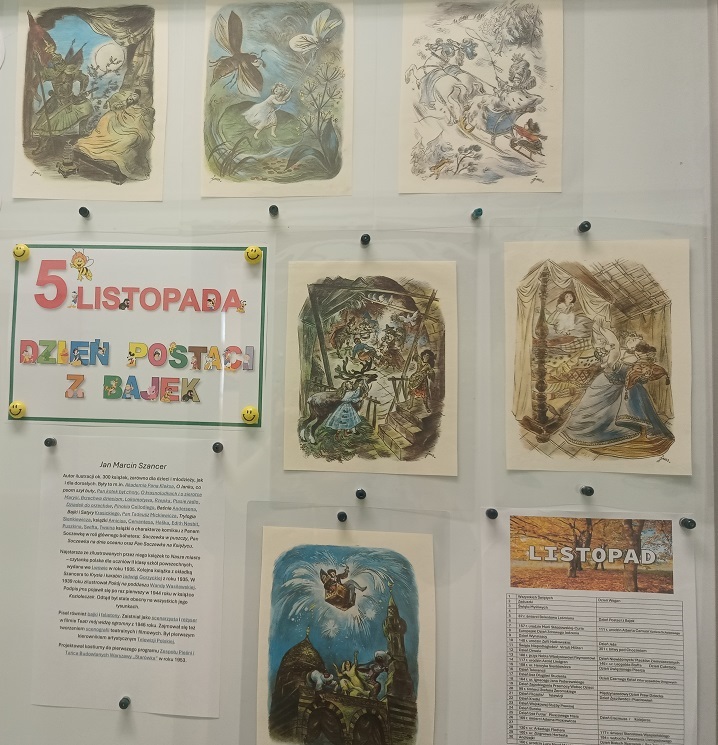 5 listopada obchodzimy Dzień Postaci z Bajek. Na tablicy przy bibliotece pojawiły się informacje o najbardziej cenionym ilustratorze baśni dla dzieci Janie Marcinie Szancerze. Uczniowie mogą pobawić się podczas przerw w rozwiązywanie zagadek dotyczących postaci z bajek w szkolnej bibliotece. W zakładce Konkursy pojawił się regulamin konkursu plastycznego "Pluszowy Miś" Zapraszamy do udziału.