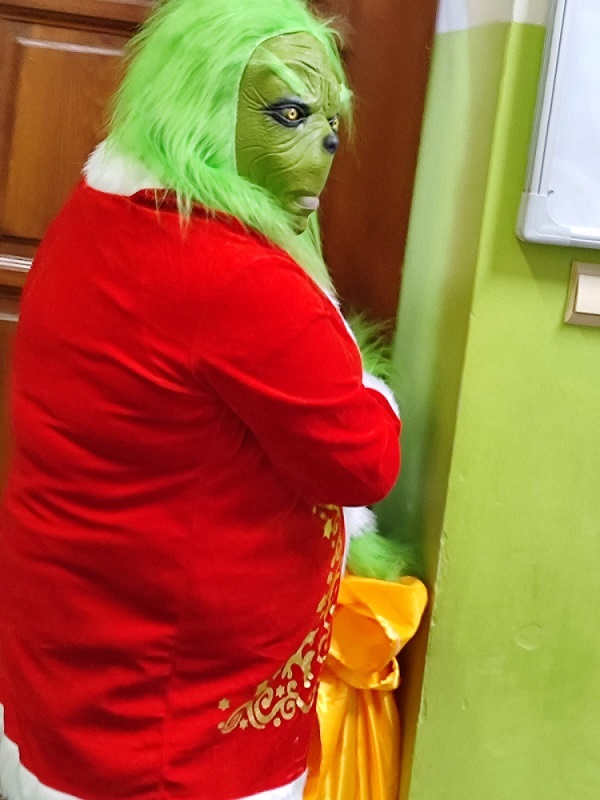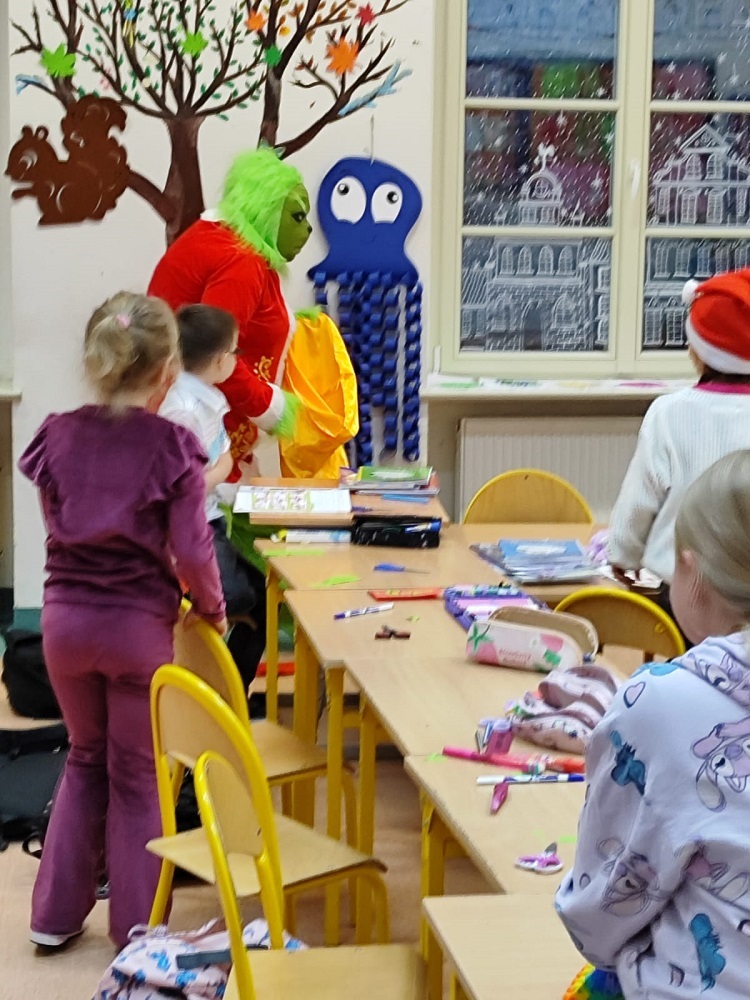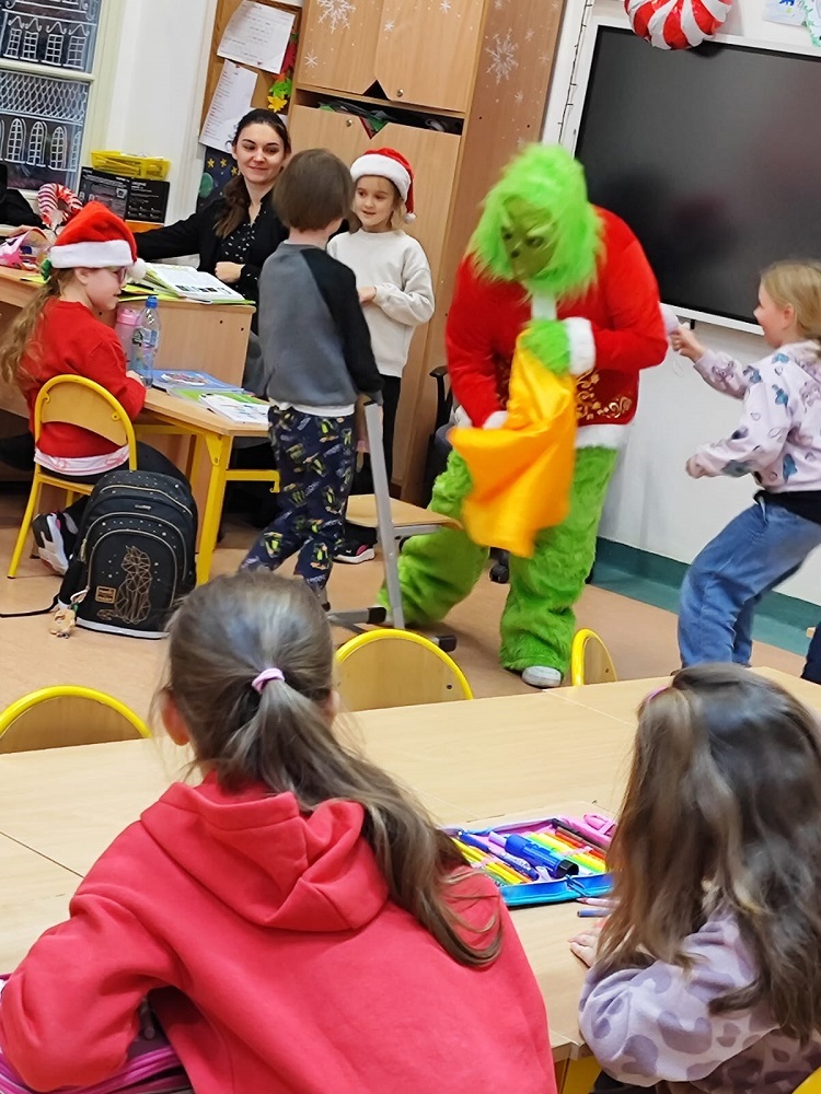 Szkołę odwiedził Grinch i psocił uczniom na zajęciach przed świętami. Klasa 5b tworzyła ozdoby świąteczne.