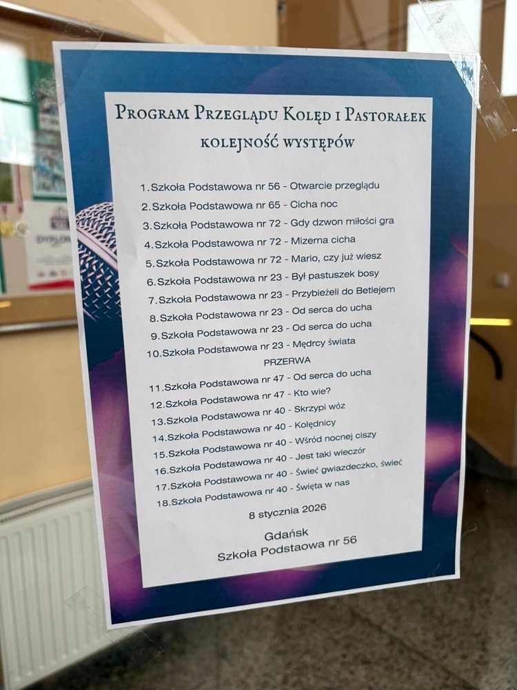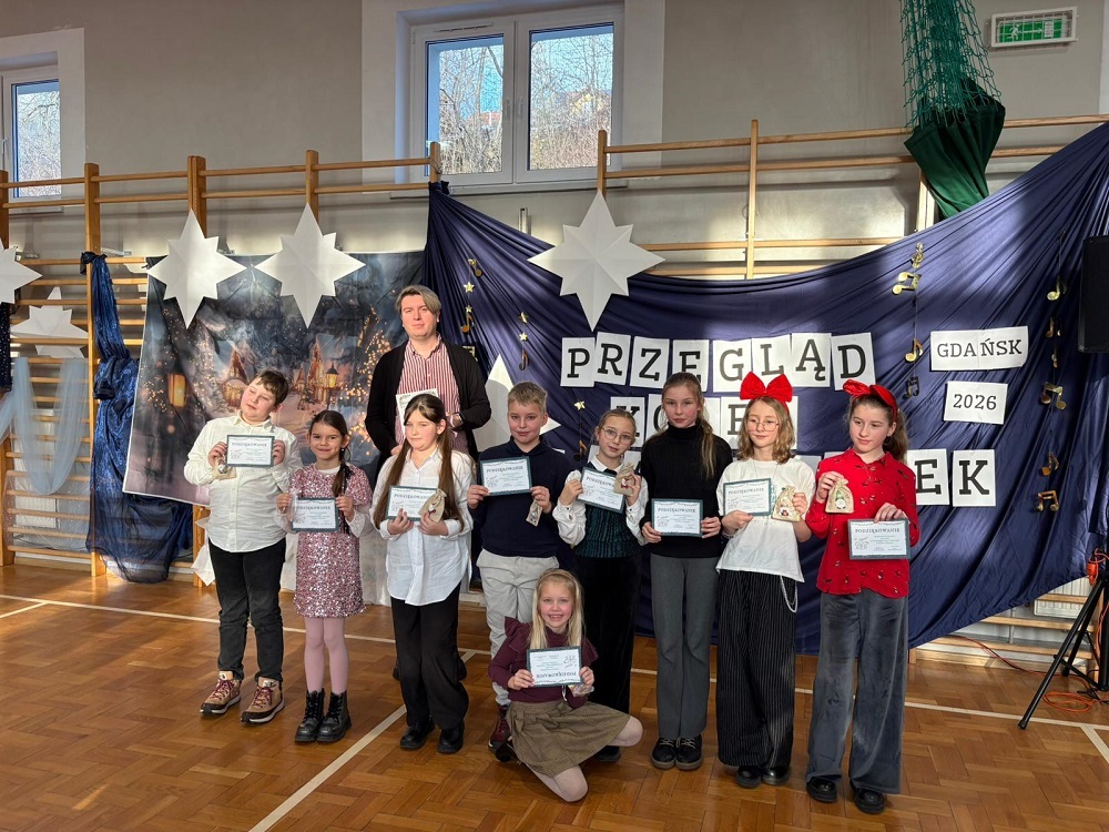 8 stycznia 2026 roku nasi uczniowie brali udział w Przeglądzie kolęd i pastorałek w Szkole Podstawowej nr 56 w Gdańsku. Wszyscy zaprezentowali wysoki poziom i zostali docenieni przez komisję konkursową.